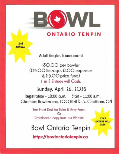 The Tournament is open to all bowers bowling in an Adult League in a Bowl Ontario Tenpin Centre and will consist of four (4) games. This is a handicap tournament based on 100% of the difference between the bowler’s average and 240. The bowler(s) with the highest score including handicap will be declared the winner(s). Any YBC bowlers that also bowl in an Adult league will receive scholarship in place of cash.
